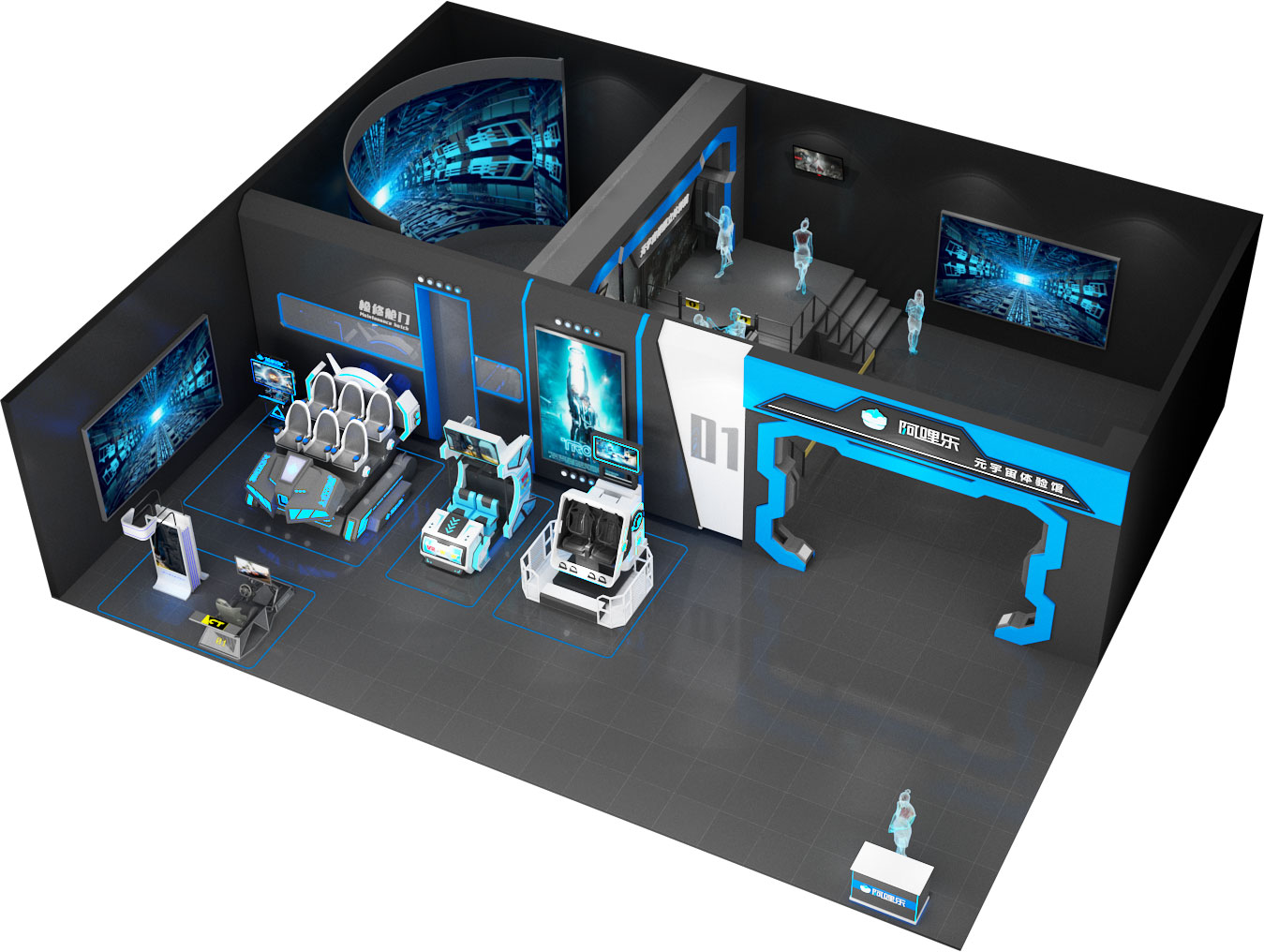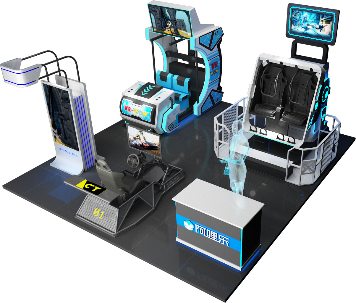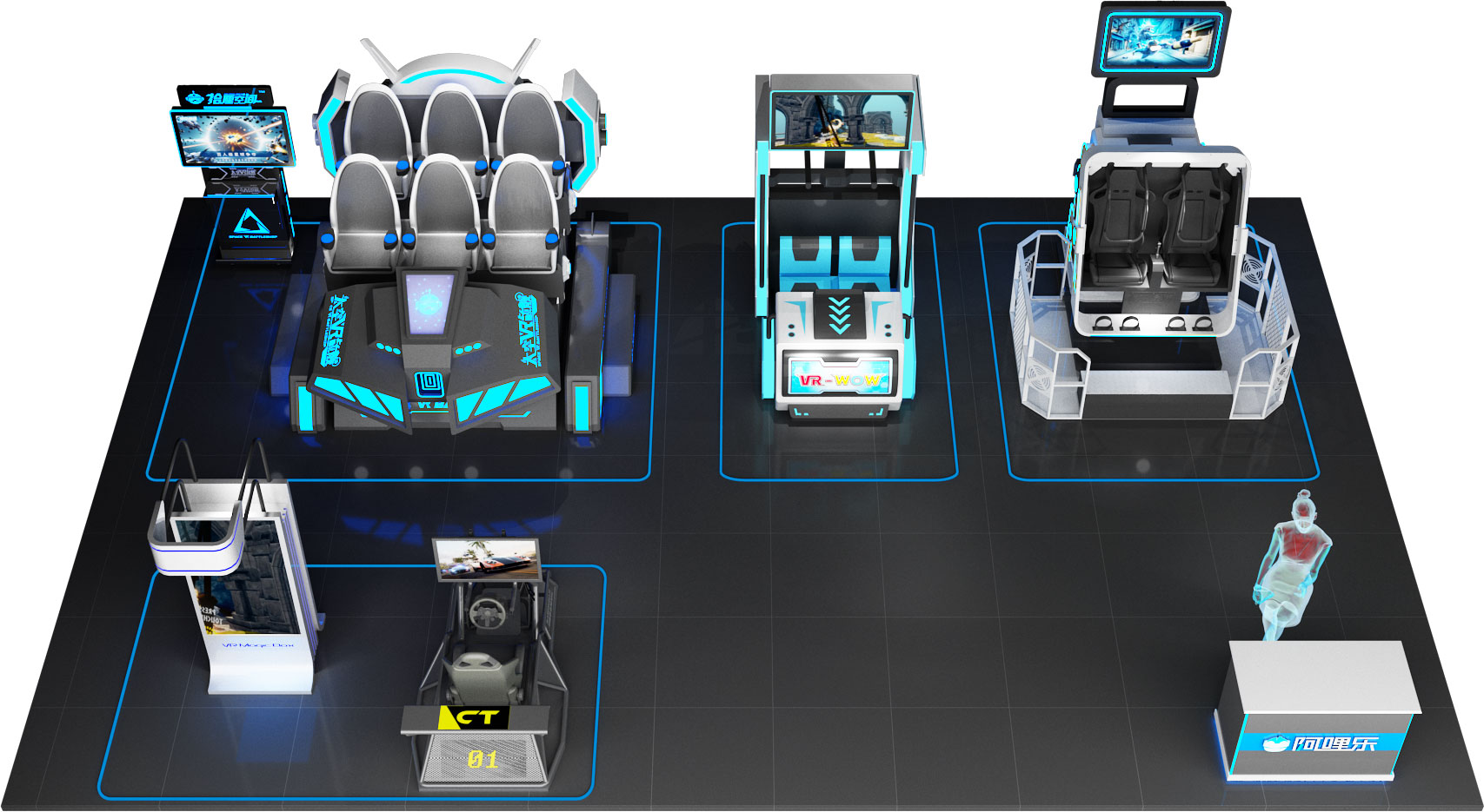 根據場地大小,投資成本,周邊的人流量分析,消費水平及喜好等,vr設備按坪效,人氣, 粘度科學組合,從0開始幫助加盟商建立一站式vr主題樂園,實現多元盈利